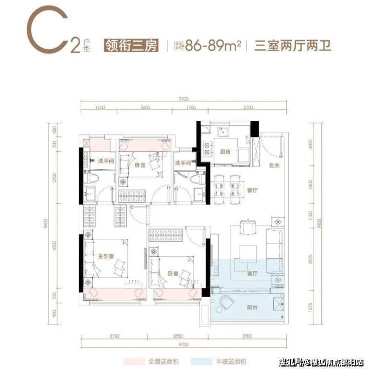 86-89㎡,三室两厅两卫 :板式户型,通透、采光,使用率最高;南向跨度,约9.7米向南,宽待家人;主卧套房,私密从容,精致生活体验;双卫生间,舒适使捷,互不干扰。