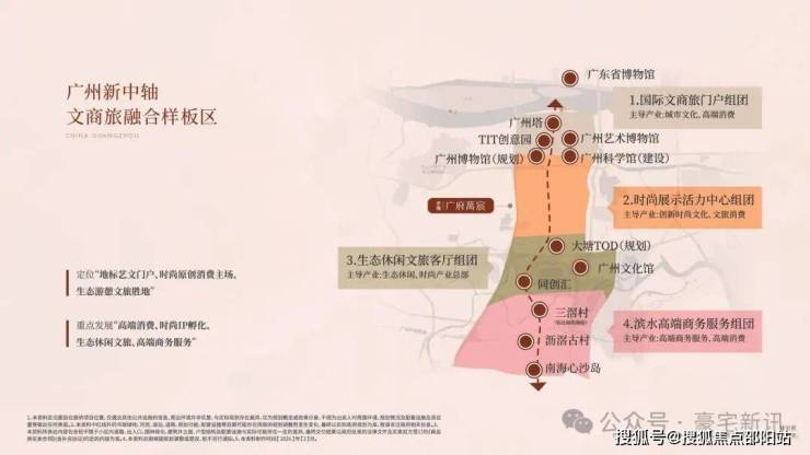 一轴三核规划,划分为四大板块:国际文商旅门户、时尚展示活力中心、生态休闲文旅客厅、滨水高端商务服务组团。国际文商旅门户已率先落地,1 塔 1 场 4 馆(广州塔、岭南广场、美术馆、文化馆、博物馆、科学馆)实景呈现。