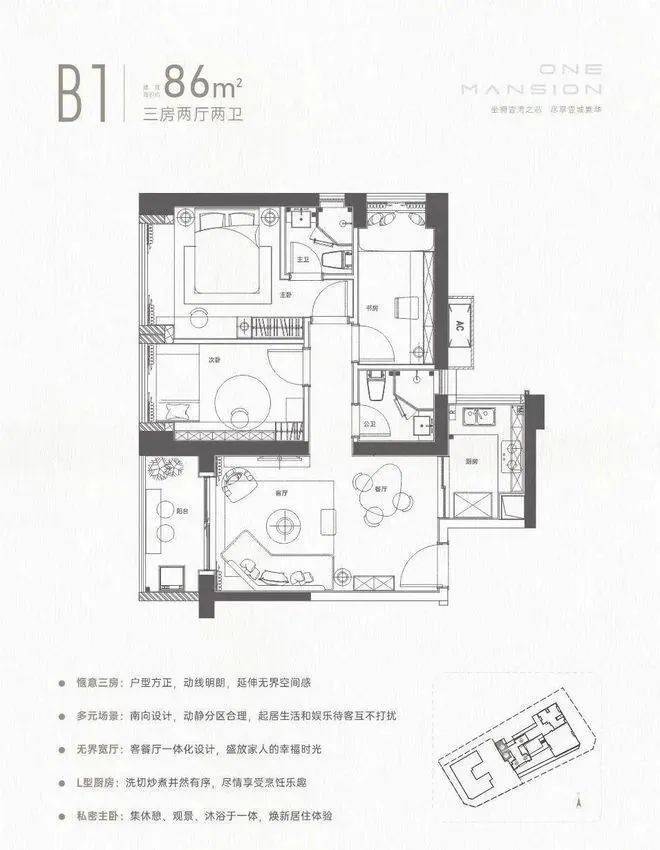 86㎡的3房2厅2卫,设计的竖厅格局,餐客厅一体化设计,三开间朝南,L型厨房,得房率72.47%(不含赠送),西南朝向。