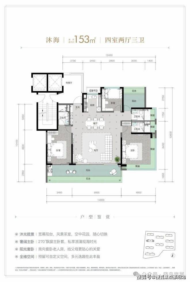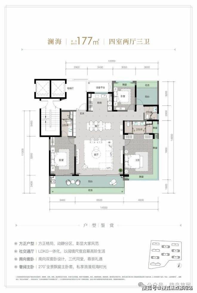 这种尺度感在户型设计中体现得淋漓尽致。以177㎡的四房户型为例,其面宽达到奢侈的约14.5米,拥有约9.9米南向观景“跑道阳台”。