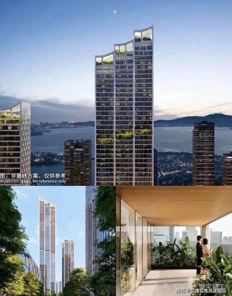 项目规划5栋超高层住宅,采用全玻璃幕墙设计,实用率超95%,主力户型为209㎡以上大平层。项目以“第四代住宅”标准打造,配备空中连廊、星空会所、架空泳池等共享空间,并融入垂直绿化体系