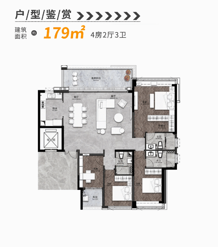 在产品设计上,明星户型约179㎡四房户型,真正诠释了何为高阶人居范本,景观性、尊贵感以及尺度感上直接拉满。