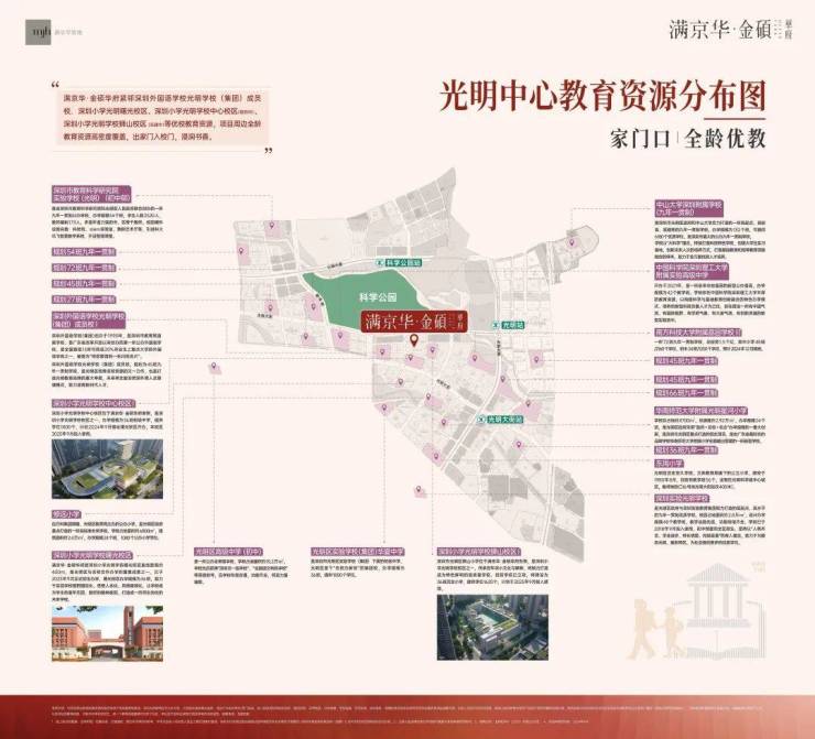 满京华·金硕项目直面占地约208万㎡的科学公园(在建中),近享深圳国际美术馆(在建中)、深圳科技馆新馆(在建中)、科学城体育中心(在建中)、光明文化艺术中心等市级文体配套;还坐拥狮山公园、约9.4万㎡的东周文化公园,约10万㎡的开明公园,约56万㎡的新城公园等丰富绿色生态资源。