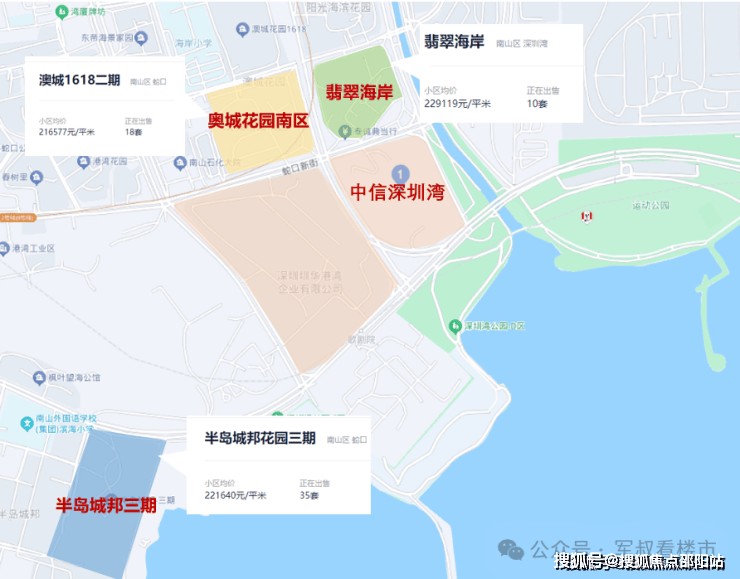 从价格来看,距离中信深圳湾目最近的小区:翡翠海岸、半岛城邦花园三期、奥城花园南区等二手房挂牌价均在22万/㎡左右(来源于贝壳),甚至巅峰期价格一度到达30万+/㎡。