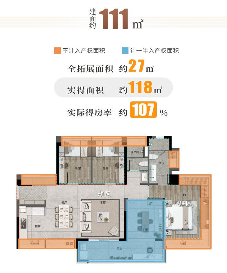 光境的王牌产品为例,建面约111平,全屋扩展面积高达约27%,整个实得面积约118平。