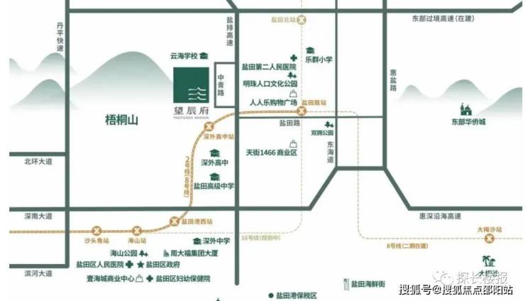山海天成(望辰府),位于盐田区盐田港中青路中海半山溪谷西侧,梧桐山半山腰上,项目所在的板块属于盐田港全新开发的区域,该片区的楼盘基本上都是在2015年之后开发的,整体面貌较新,都是高档小区,附近有2/8号地铁线“深外高中地铁站”。