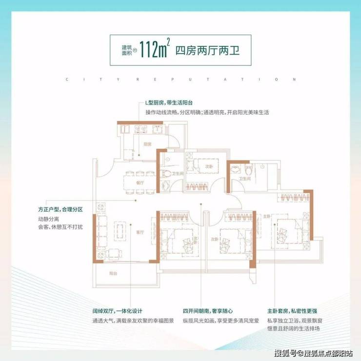 112㎡的4房2厅2卫,设计的是经典竖厅格局,客厅3.9米开间,LDKB一体化,动静分区,四开间朝南,主卧270°转角飘窗,L型厨房还带1个生活阳台,卫生间干湿分离,得房率:78.43%(不含赠送),东南朝向。