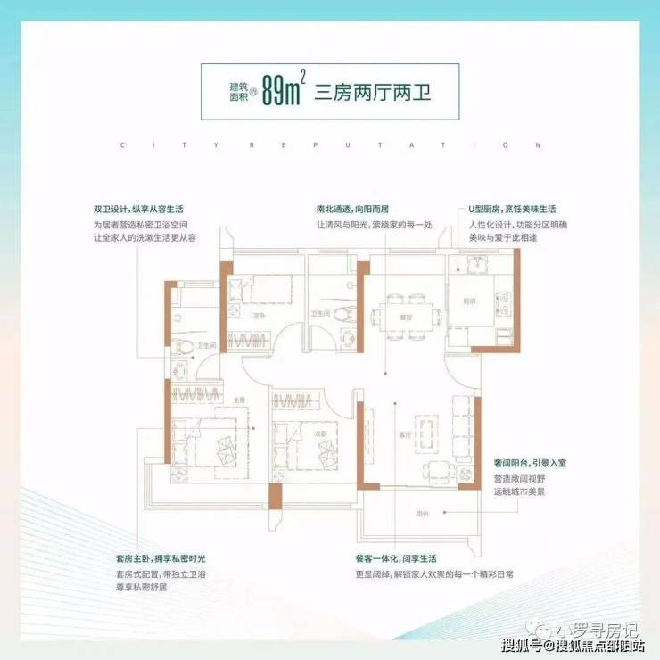 89㎡的3房2厅2卫,5栋02户型,设计的是经典竖厅格局,客厅3.6米开间,LDKB一体化,动静分区,三开间朝南,主卧270°转角飘窗,U型厨房,卫生间干湿分离,得房率:74.71%(不含赠送),西南或东南朝向。