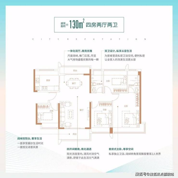 130㎡的4房2厅2卫,设计的是竖厅南北通透格局,客厅4.1米开间,一体化双厅双阳台,四开间朝南,主卧270°转角飘窗大套间设计,U型厨房,卫生间干湿分离,得房率:78.43%(不含赠送),阳台主朝东南向。