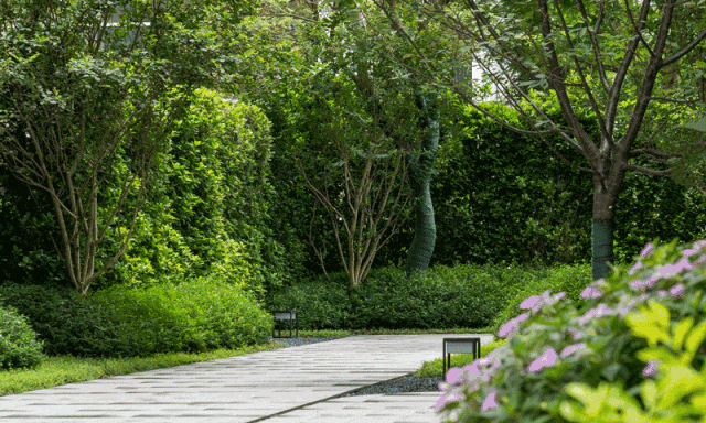 叠院宽阔的走道,两边还有树木遮挡。