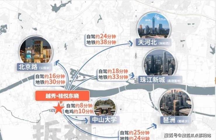 通过自驾方式,越秀·桂悦东晓可0红绿灯直达天河,大大缩短了通勤时间。同时,项目距离珠江新城(珠城)和琶洲会展区也仅约20分钟车程,让居住者能够轻松享受这两个区域的繁华与便利。