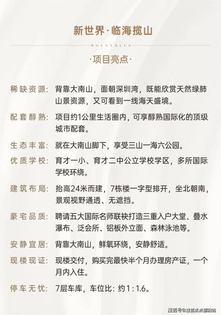 -教育配套:新世界临海揽山幼儿园、育才一小、育才二中、深圳贝赛思国际学校、深圳蛇口国际学校、太子湾国际学校、韩国国际学校、深美国际学校等众多国际学校。