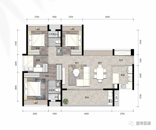 1、幸福三房,尺度宽阔有序,承载更多欢乐