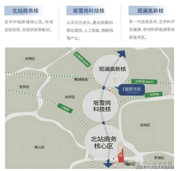 项目毗邻规划中的地铁22号线观湖枢纽站,仅400米之遥,同时,还将成为地铁18号线与22号线的交汇点,未来还将开通深广中轴城际,交通网络四通八达,半小时即可抵达福田中心区,集地铁、云轨、城际于一身,打造鹭湖枢纽中心。