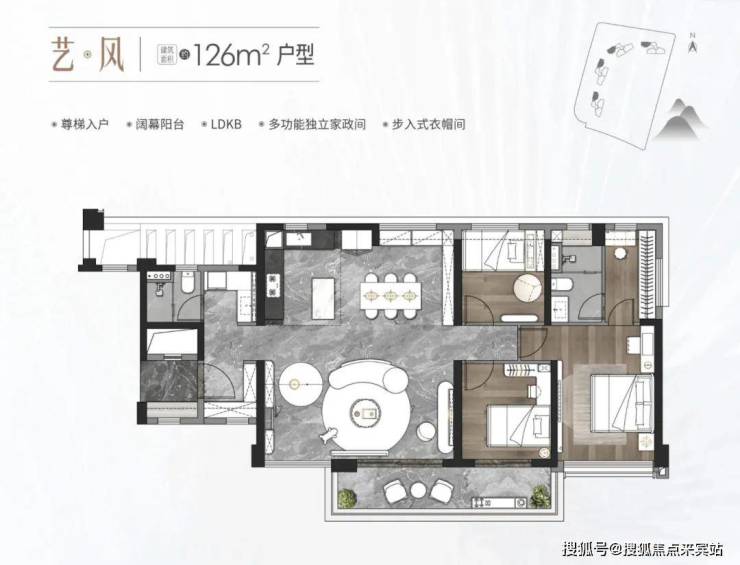126㎡户型采用尊梯入户设计,拥有阔幕阳台、LDKB 一体化空间、多功能独立家政间和步入式衣帽间,空间布局合理,实用性强。