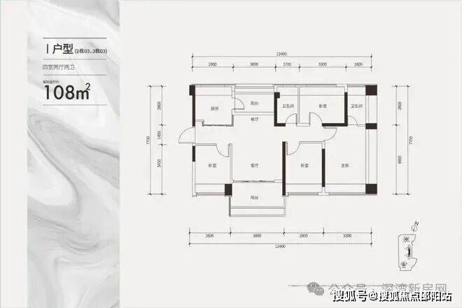 建面约108㎡双龙抱珠四房户型