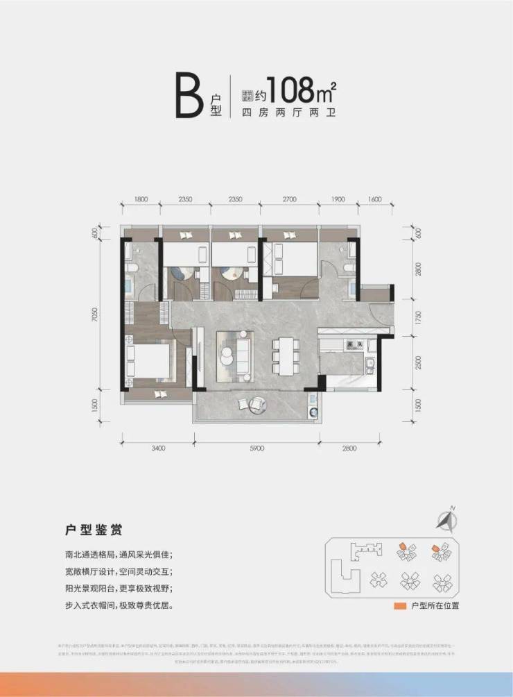 108㎡户型做的是横厅,动静分区,四房两厅一厨两卫一阳台的格局,这种户型最近几年非常常见了,优点就是横厅显得客厅更宽,有宽景阳台,室内通透性略好一些