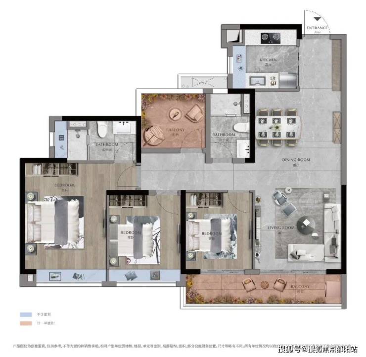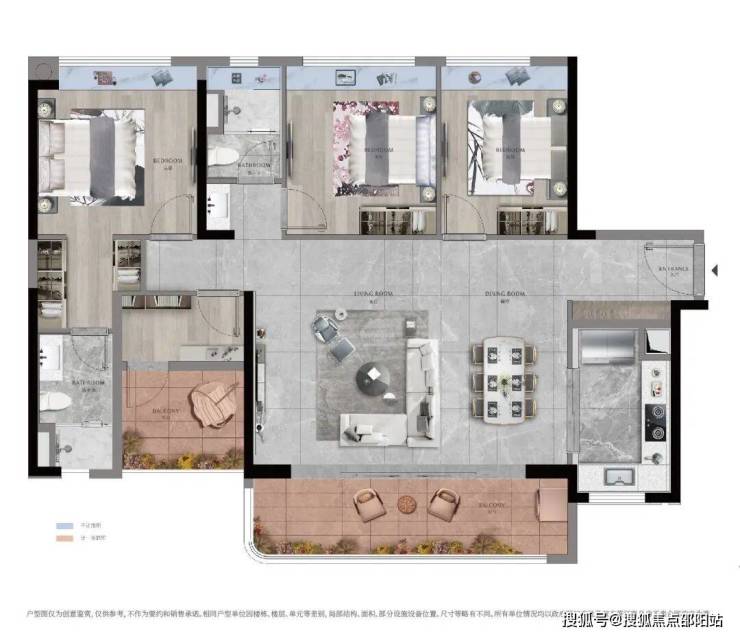 120㎡三房两厅两卫,约13米西南向四面宽,全明采光,有6.5米阳台,尽揽园林胜景。