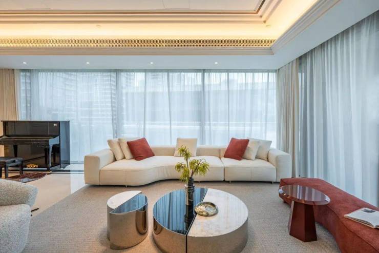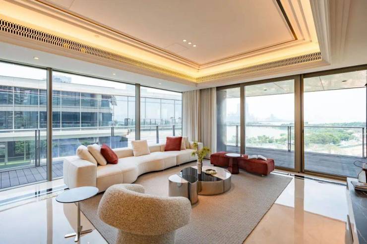 80平餐客厅,厅出50平大阳台,3.3米极限层高,透过270度无遮挡景观面,感一座城市的春夏秋冬