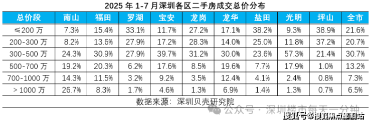 据深圳贝壳研究院数据显示,今年1-7月4万元以下成交占比达到42%,居各单价段之首。