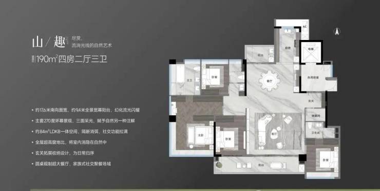 「山趣」建面约 190㎡匠心臻品,以极致尺度与视野,将自然盛景融入生活日常。约 17 米南向恢弘面宽,搭配全屋超高窗地比设计,让阳光与清风肆意流淌;全南向功能空间布局,营造通透敞亮的居住体验。