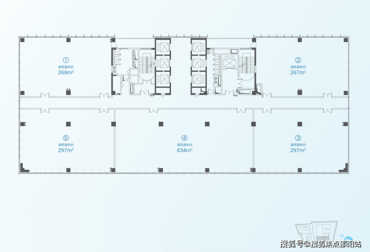 研发办公A座 约2.7万㎡,22层,标准层约1565㎡,每层5户,户型面积区间约267-434㎡,方正实用,可灵活组合,层高4m,荷载300kg/㎡。