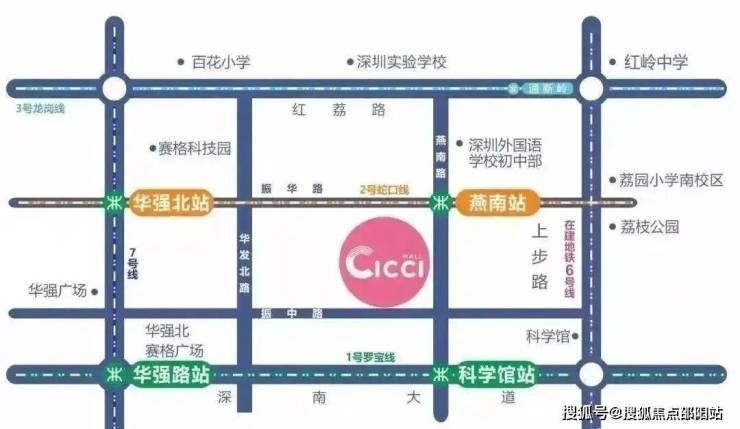 宝树台华玺公馆位于福田重要地段,地处深圳市福田区核心地段的CICCI Mall,南接华强北商圈,西望福田CBD,邻近莲花山公园、笔架山、银湖等自然风景区,地理位置十分优越。从交通上来看,CICCI Mall无缝接驳地铁2号线燕南站,周边汇集1号线、2号线、3号线、6号线(建设中)、7号线、9号线等六条地铁线,700米范围内汇聚9个地铁站出入口和21个公交车站台,数十路公交车经停这些站台,交通十分便利。