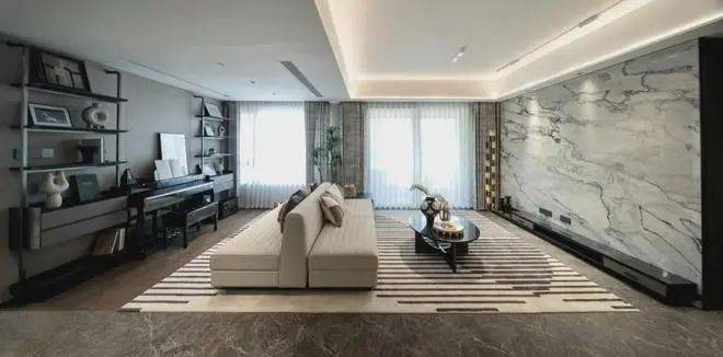 客厅面宽达到4.4米,尺度比市面上大多数140㎡户型都要大,如果不需要那么多房间,也可以将客厅与次卧打通,获得约7.4米长的超大横厅,或者也可以参考样板房设计,将其布置成家庭的私享影音空间。