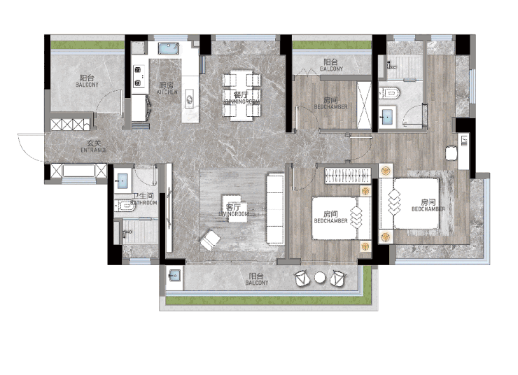 最令人感到惊艳的当属约7.4米长的三面景观阳台,不仅能最大化将景观揽入视野,还可以根据个人习惯爱好布置喝茶区、健身区、萌宠乐园等功能空间,为生活赋予更多乐趣。