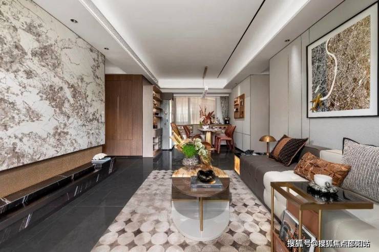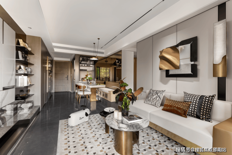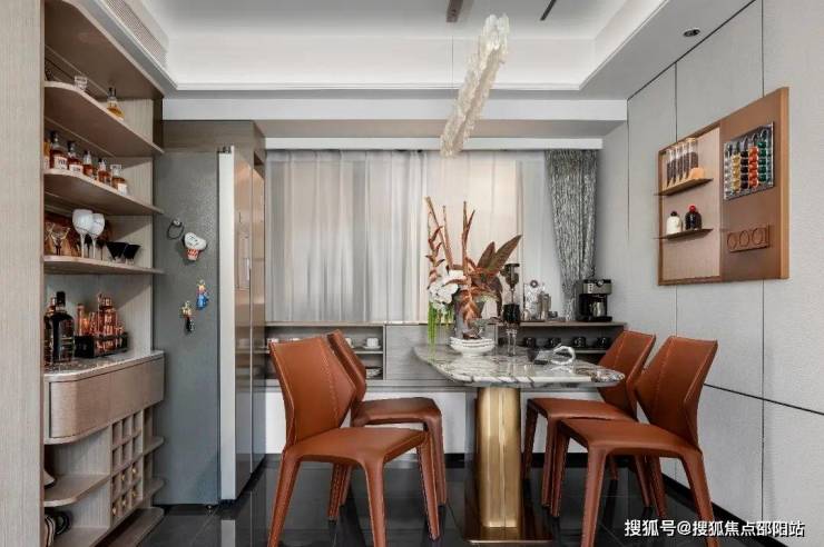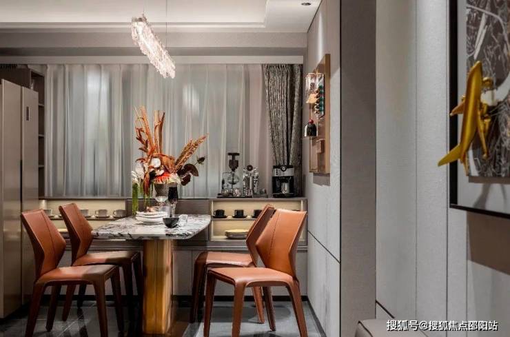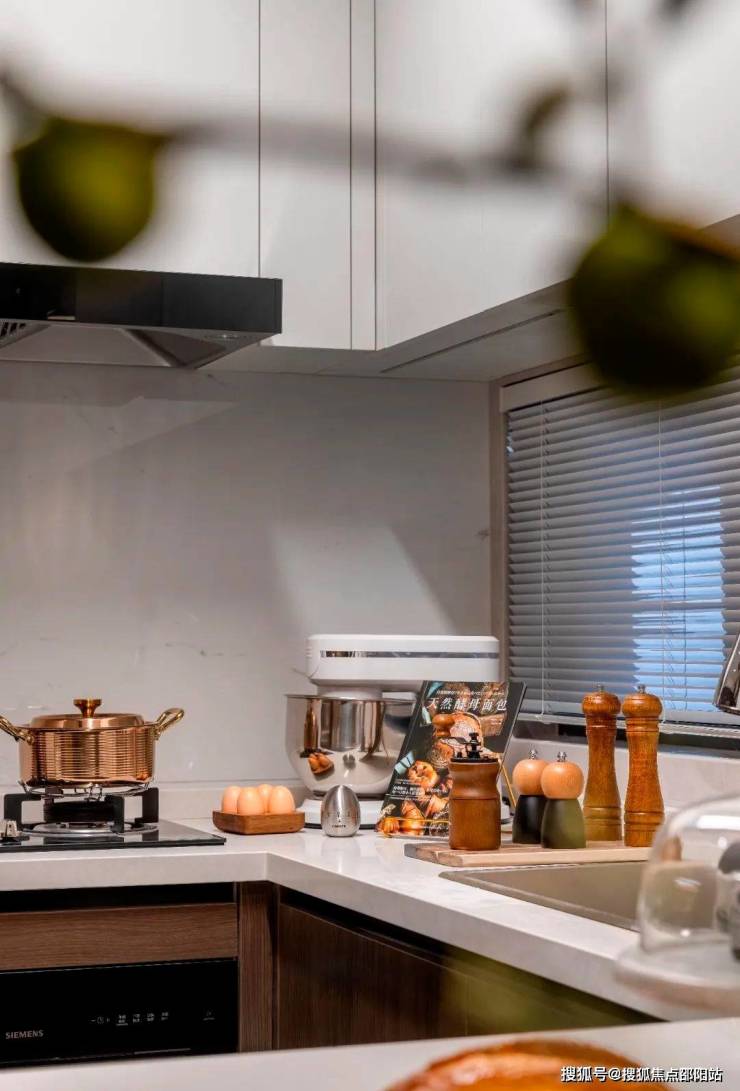 例如,客餐厨一体化的设计,再加上连通大尺度的景观阳台,让整个公区更加灵动阔绰,充分延展了家人的休闲空间。