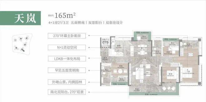建面约165㎡大户型,三大极致打造相当震撼,朝南面宽达到约17.4米、近9米L型景观阳台、大方厅设计,景观阳台。