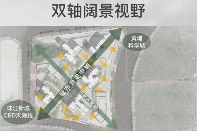 楼型48°设计,形成极致景观视野,目之所及皆风景;双轴景观中轴,一轴历史人文生活轴线,一轴珠江新城CBD与黄埔新城磅礴天际线,一览无余。