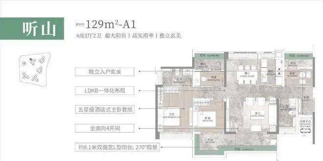 建面约129㎡听山户型,阳光玄关设计,兼容了户内的私密性,储物空间又是全明采光,也符合广东地区对风水的理解,舒适性和实用性都考虑到。