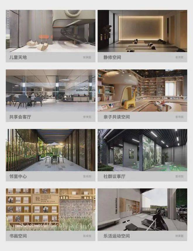 【八大生活空间】儿童天地、静修空间、邻里中心、社群议事厅、共享会客厅、亲子共读空间、书画空间、乐活运动空间