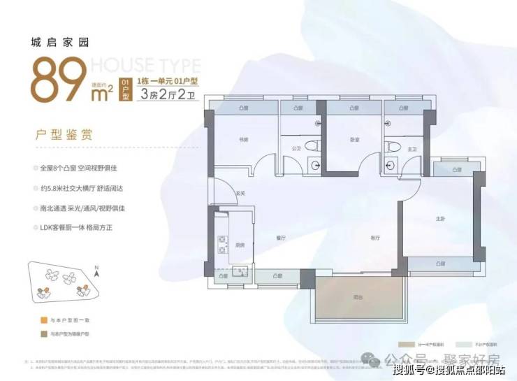 西南或东南向,户型是横厅南北通透格局,客餐厅5.8米开间,主卧双飘窗南北通设计,8个飘窗加阳台使用率在90%左右。