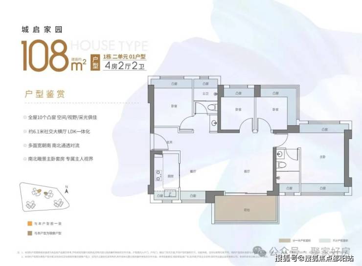 108㎡的4房2厅2卫,西南或东南向,横厅南北通透格局,进门独立玄关,客餐厅6.1米开间,主卧双飘窗通透设计,全屋10个凸窗,飘窗+阳台使用率在90%左右。