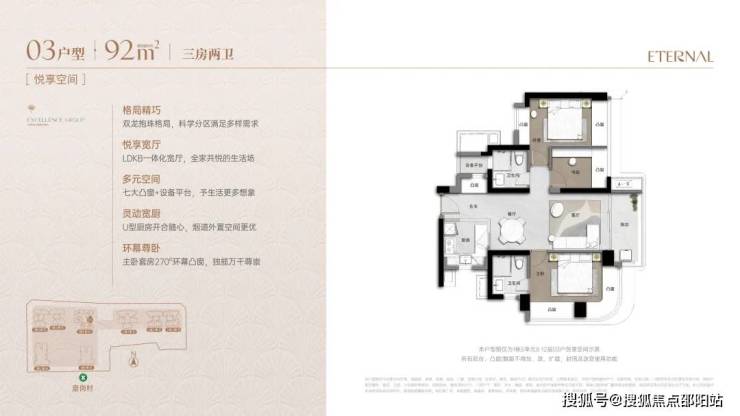 采用双龙抱珠格局,灵活适配成长型家庭。LDKB一体式布局,配备270°环幕主卧套房、U型厨房及七大飘窗,空间动静分离,实用且可变。