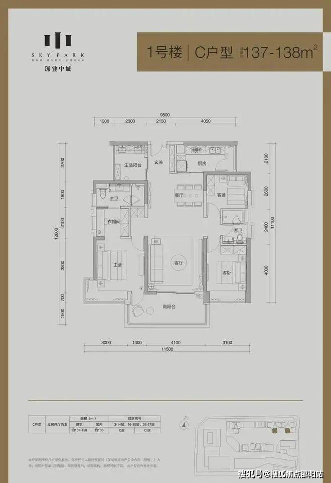 1栋:产品是面积段为137-185-192㎡的3房、212㎡的4房、以及4套300㎡以上的顶层复式单位,其中36层及以下为2梯3户“品”字形结构,37层及以上为2梯2户的板楼结构;