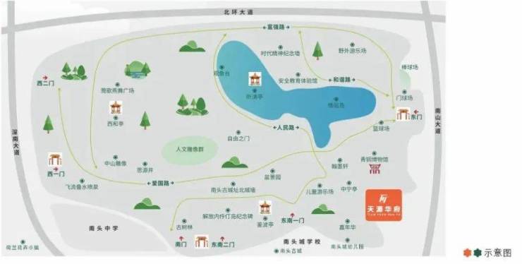 ▶ 生态环境:天源华府项目南、西、北三个方向被中山公园环 绕,可谓是真正的“家在公园中”。南边则是南头古城,直线距离约1.1公里有荷兰花卉小镇,约1.3公里有荔香公园,生态环境非常不错。