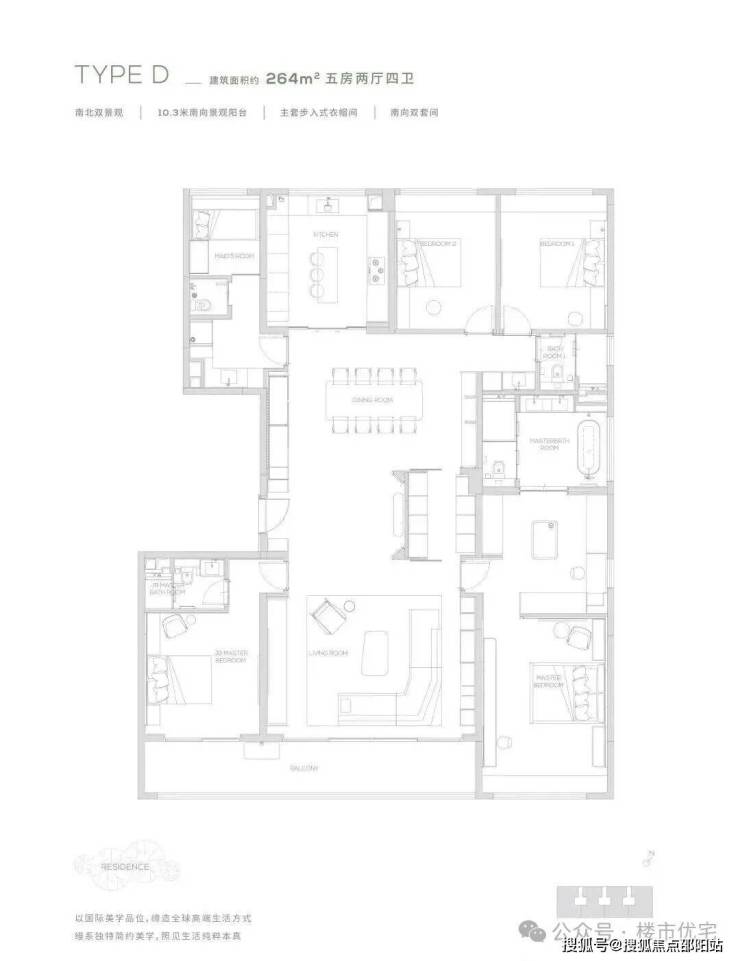 264㎡为五房两厅四卫产品,更细腻的产品设计,超奢华四件套南向主卧,标准南向次主卧, 6.6米巨型方厅,纵向超长LDK一体化空间,专属家政保姆空间,超大容量收纳空间,令居住的尊贵从每处品质细节里流露而出,创造独一无二的奢享体验。