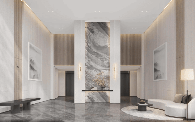 楼栋的首层入户大堂同样阔气,光是层高就做到了6.6米,相当于普通楼层的两层高度。