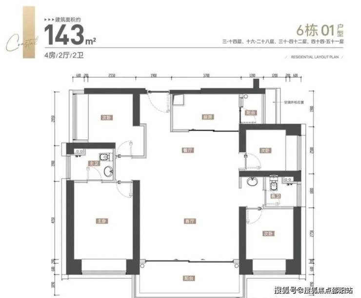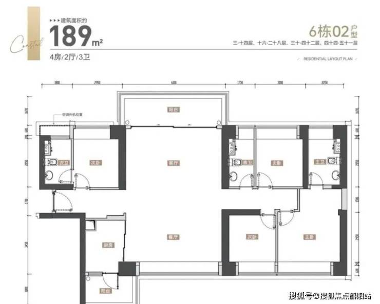 01户型142平4房2卫,02-03户型188平4房3卫,为楼王单位,层高3.15米,3梯3户。