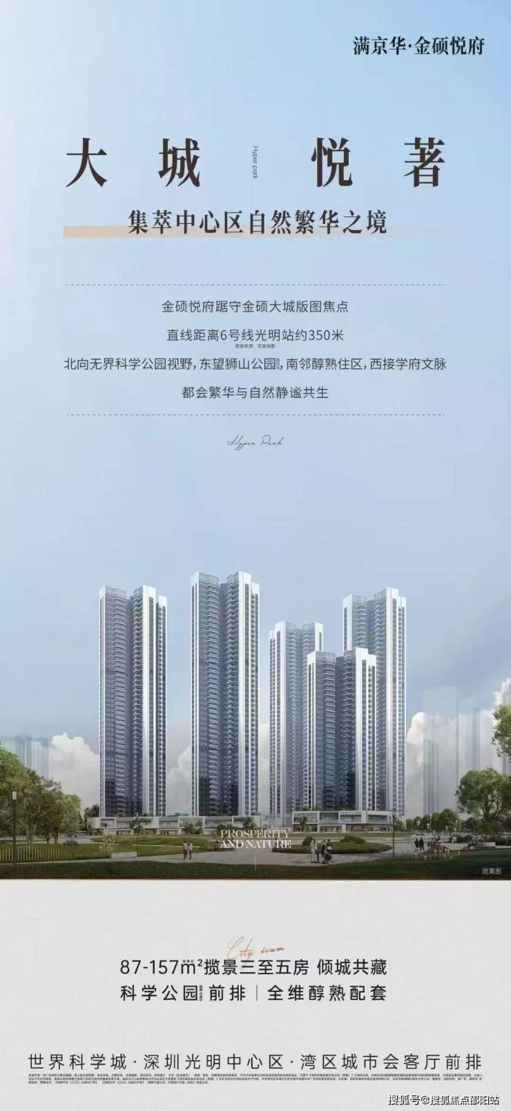 满京华金硕悦府,由满京华集团打造,总占地面积约2.61万㎡,总建筑面积约21.8万㎡,计容建筑面积约15.53万㎡,容积率5.95,绿化率30.01%,共由5栋32-48层高的住宅组成,其中1栋1/2单元住宅48F,2栋1单元住宅32F,2栋2单元住宅47F,3栋住宅48F,4栋是1所幼儿园,还配建有社区菜市场。