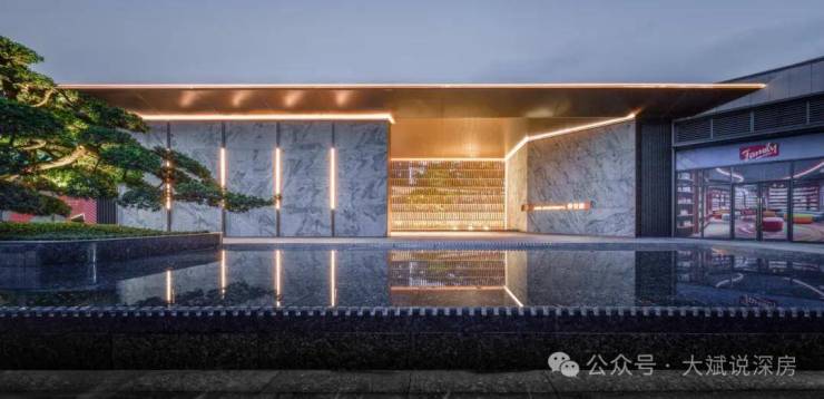 主入口依靠回龙河畔,在开敞式迎宾前广场设置跌水景观,结合名贵树种罗汉松,让尊崇出入道是寻常;超30m门庭设计,以仿古代照壁之手法,精选浪淘沙天然石材与古铜型材,尽显当代精奢雅致气质,演绎独属于东方门第的尊崇仪式。