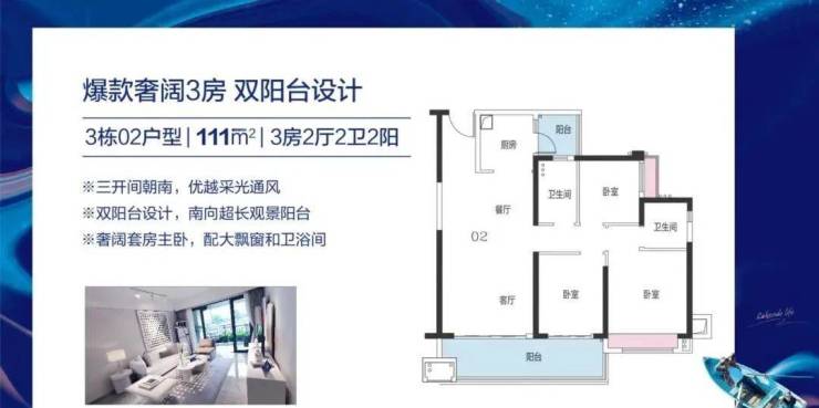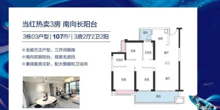 建筑面积约95㎡的舒适三房,双阳台设计,一边用于晾晒,一边用于观景,实用性满分。