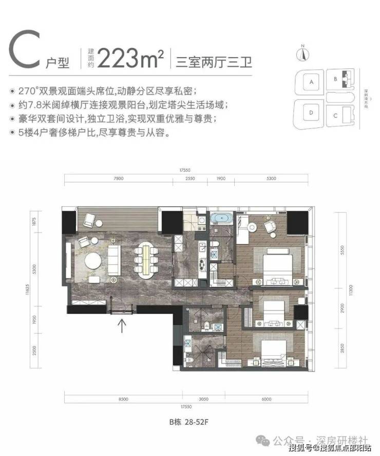 C户型:约223㎡3房2厅3卫:B栋28-52F(高区),东朝向