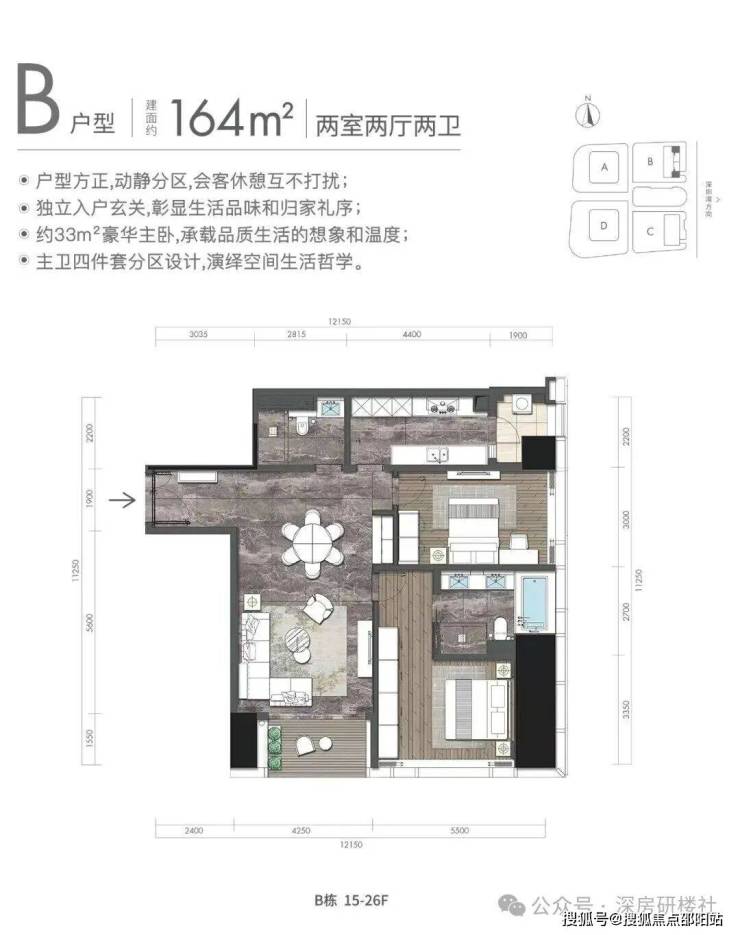 B户型:约164㎡2房2厅2卫:B栋15-26F(中区)端头户型,东朝向