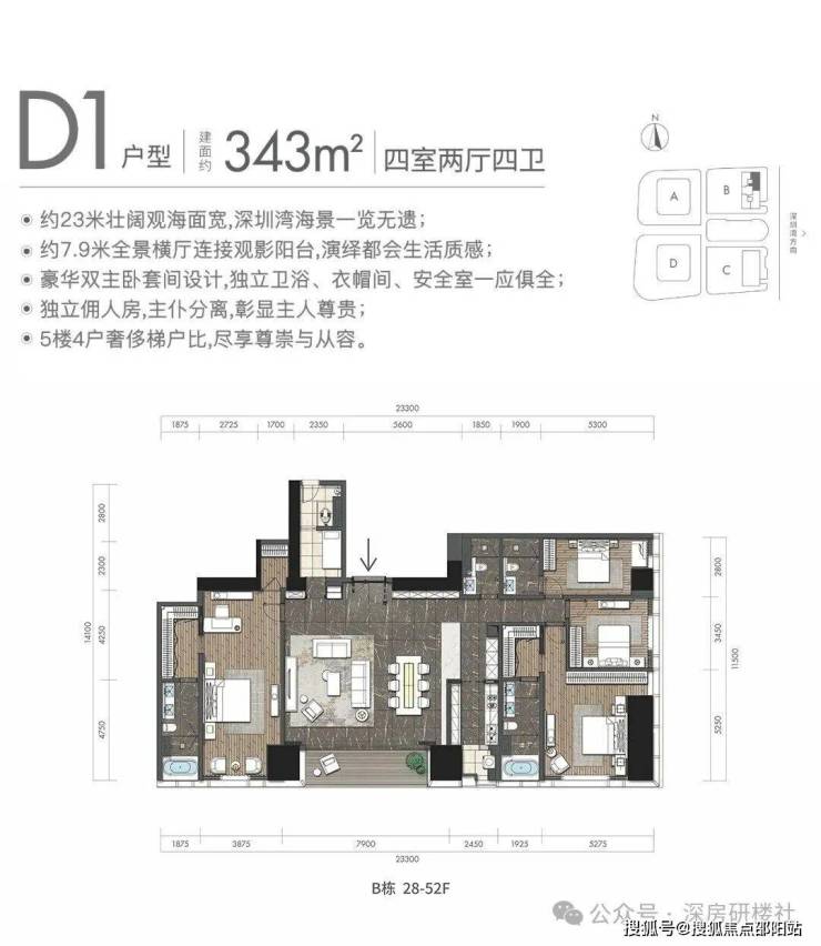 D1户型:约343㎡4房2厅4卫:B栋28-52F(高区),东朝向