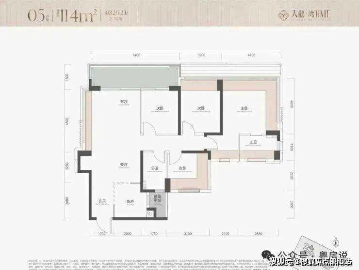 115㎡4房2卫,横厅户型,朝南看海,入户独立玄关,但三个次卧朝北;