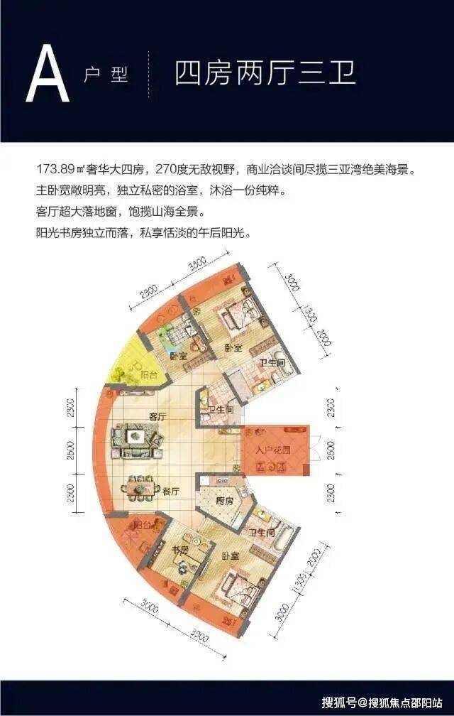 173.89㎡奢华大四房,270度无敌视野,商业洽谈间尽揽三亚湾绝美海景。主卧宽敞明亮,独立私密的浴室,沐浴一份纯粹。客厅、餐厅、景观阳台三位一体,既可与家人品味佳肴,又可邀约朋友高端人士欢聚一堂。